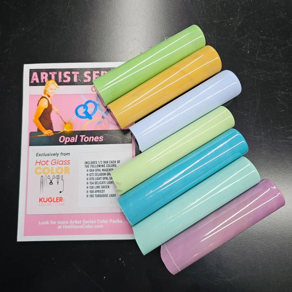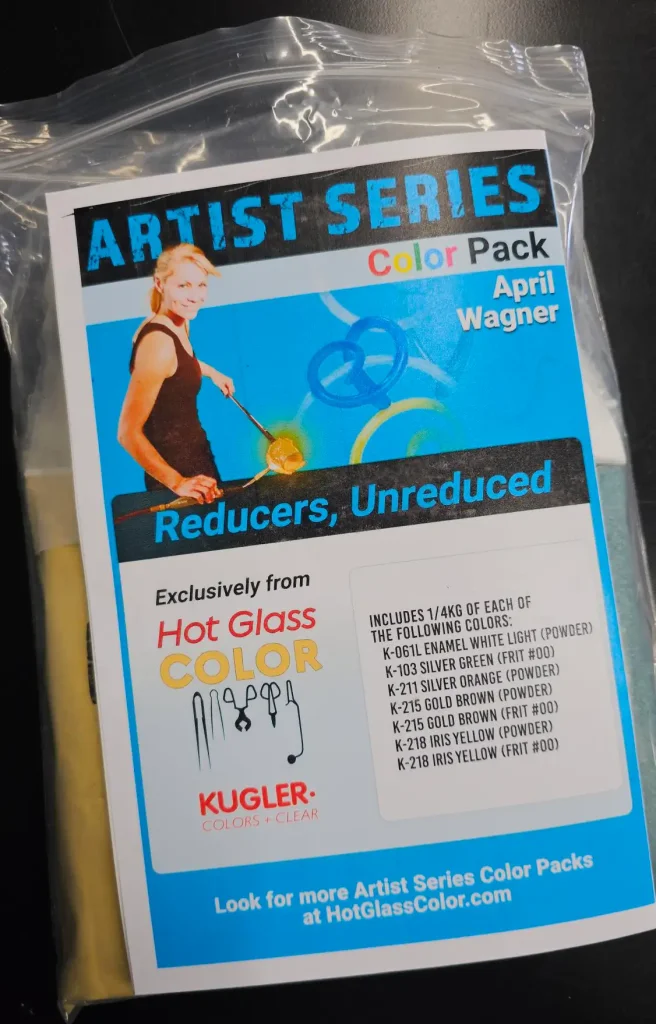 April loves to work with glass color. She has, over the years, become an expert at using color in glass. But it was still a great honor when Hot Glass Color and Supply, the leading source for glass color in the US, asked her to put together two signature artist packs of color. She chose her favorite pastels for one and her favorite powders and frits for the other. Want to read a deep dive about glass color? Check out our blog post here.