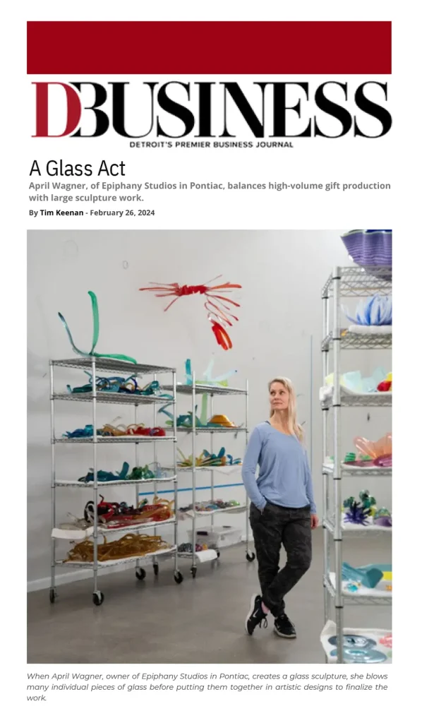 The most influential business magazine in Detroit, DBusiness, did a feature story about April, her passion for glass, and the amazing team at the studio. Read the article here.
