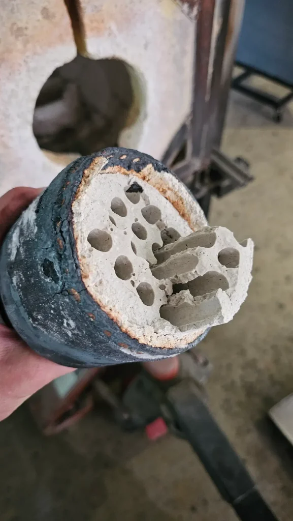 We shut our furnace off for scheduled maintenance and rebuilt our reheating chamber. We also hard-piped in new gas lines at the ceiling so we would no longer have to walk over them on the floor.