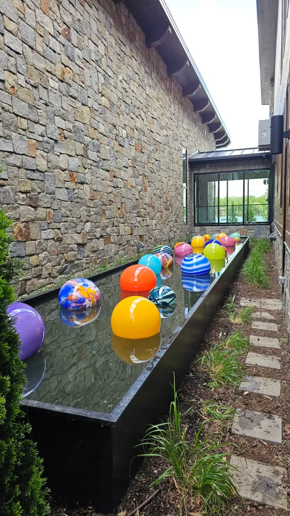 The long cold days of winter are no time to rest on your laurels. It’s the best time to make big glass. The heat from our large reheating chamber is no joke and not for the faint of heart. 3′ x 4′, this monster runs at 2400 degrees and will burn you badly if not treated with respect. We had a fun project creating gazing pond floats for a private residence. Using our whole team of 5 glassblowers we really had a good time with this project, trying new color combos and techniques to create a bright, fun palette of glass that pops in the landscape. Want to know more about working on big glass? Read our blog post here.
