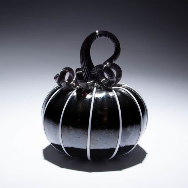Created from the furnace of a woman-owned glass studio in Pontiac, Michigan, USA. Most importantly, the elegant glass art pumpkin is a testament to American craftsmanship and the love for fine art. Each piece is truly unique, showcasing the artistry and dedication used in creating it. This bold black and white pumpkin serves as an eye-catching centerpiece. Our Black Lantern Glass Pumpkin can also be displayed as a beautiful year-round decoration.