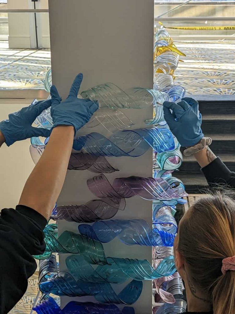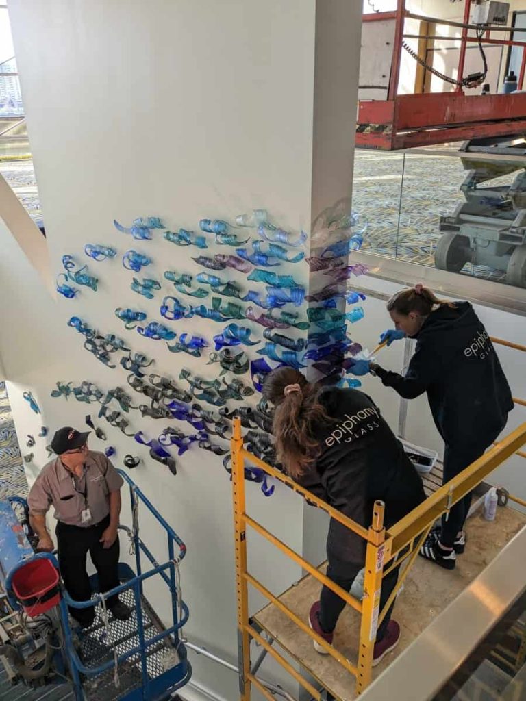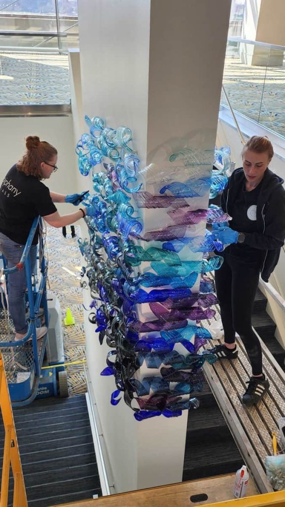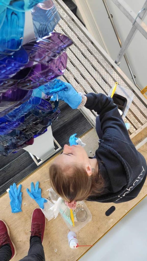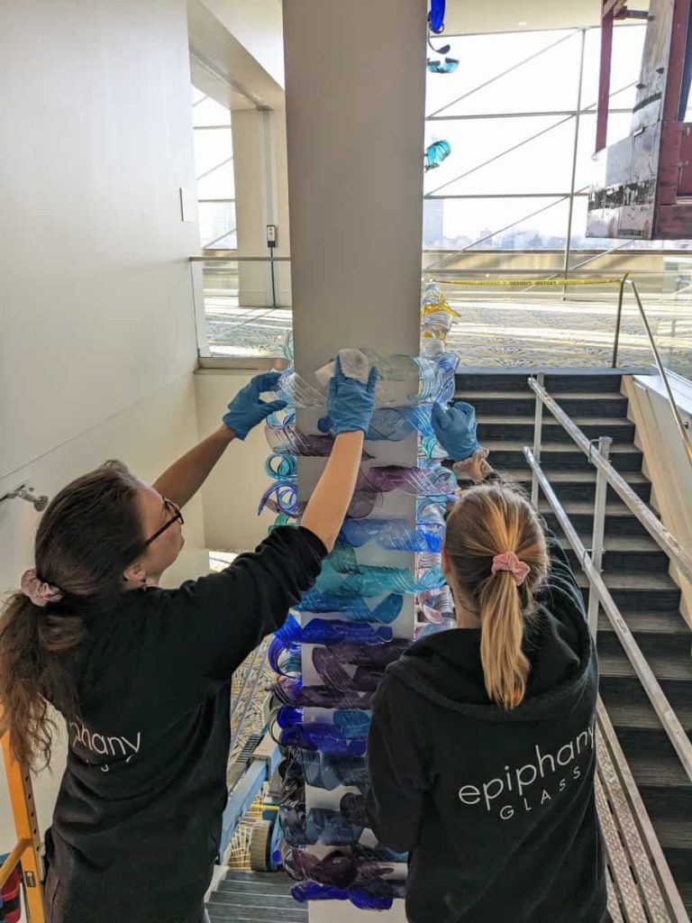 Cleaning the Solstice sculpture was no easy feat. The intricate design and size of the sculpture posed a challenge. The delicate glass surface required a gentle touch, and any misstep could result in damage to the artwork. Moreover, the height of the sculpture made it difficult to access certain areas, adding another layer of complexity. With their expertise in glasswork, the trio knew exactly how to handle the situation. They carefully assessed the sculpture and designed a cleaning plan that would ensure it was cleaned thoroughly without causing any damage. And with the help of the dedicated and experienced maintenance staff at TCF, they were able to lift our team to dizzying heights to tackle this enormous cleaning project!